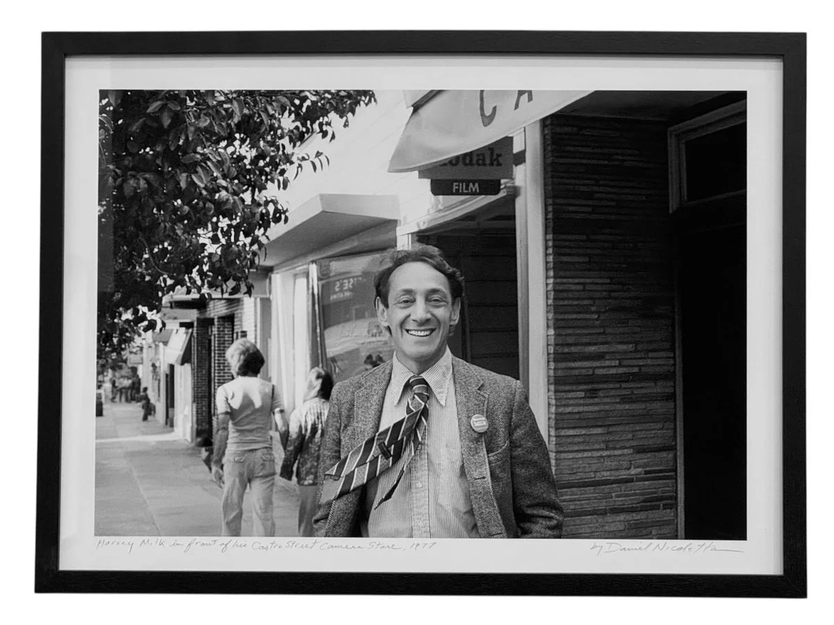 Photograph of Harvey Milk outside the historic Castro Camera storefront, 197713"x18" open edition print, signed with description by Dan Nicoletta, .5" black frame